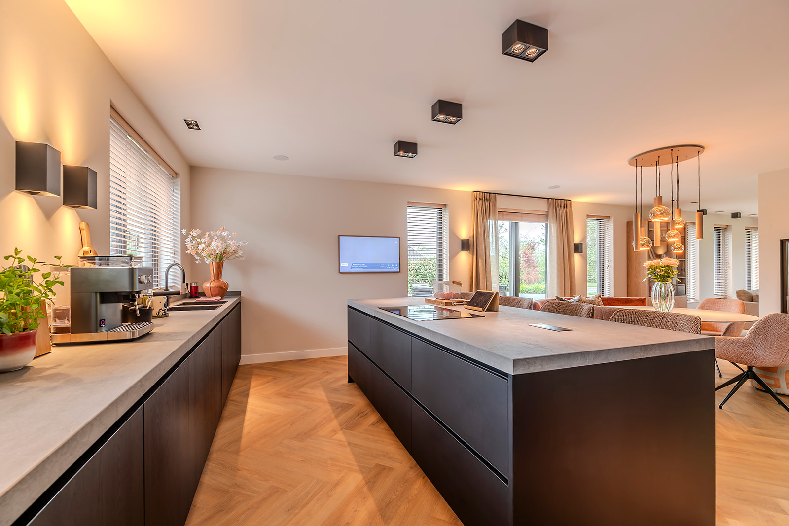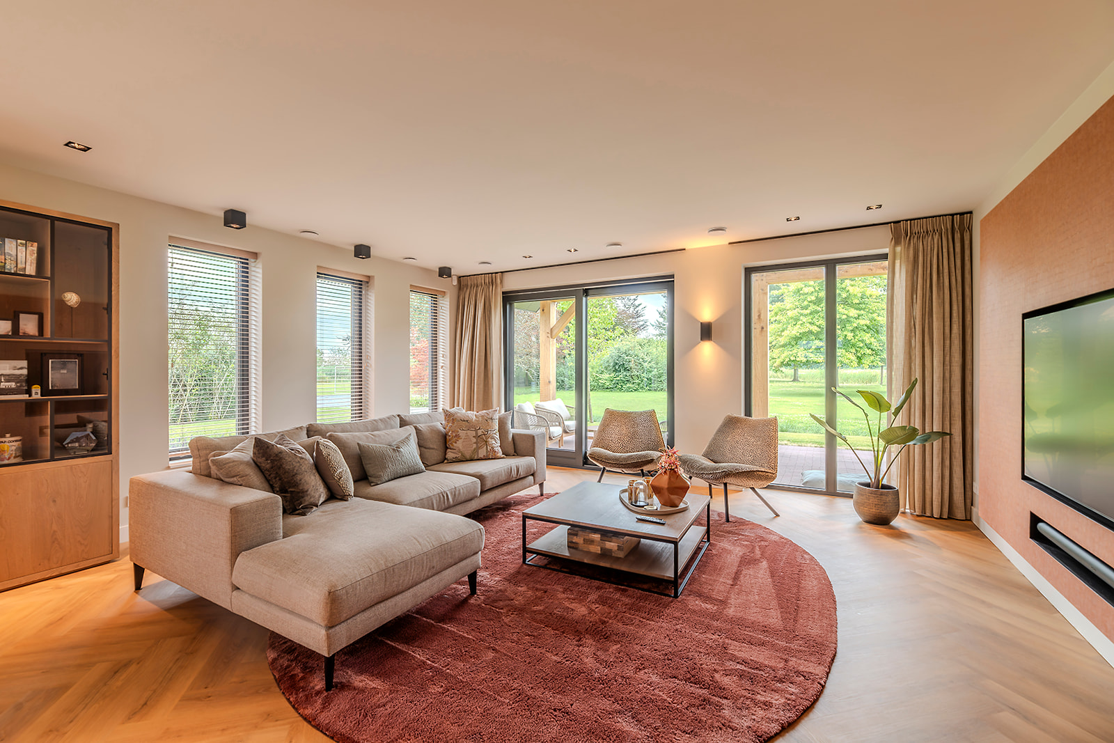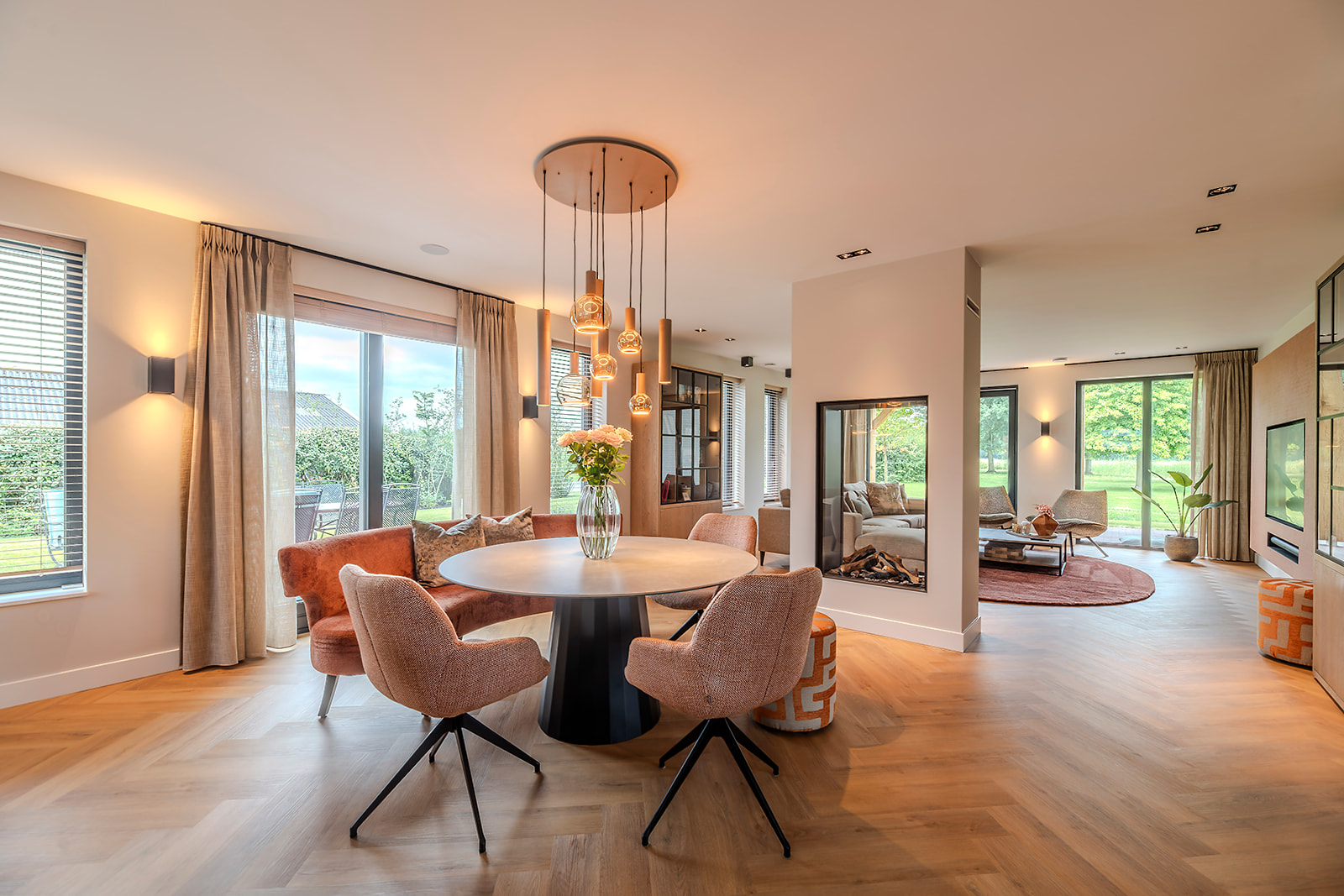 Binnen is gekozen voor een doorkijkhaard die de woonkamer en keuken op een sfeervolle manier met elkaar verbindt. De woning heeft een open structuur. Hierdoor voelen de ruimtes ruimtelijk aan en kan het daglicht via de vele raampartijen rijkelijk naar binnen stromen.