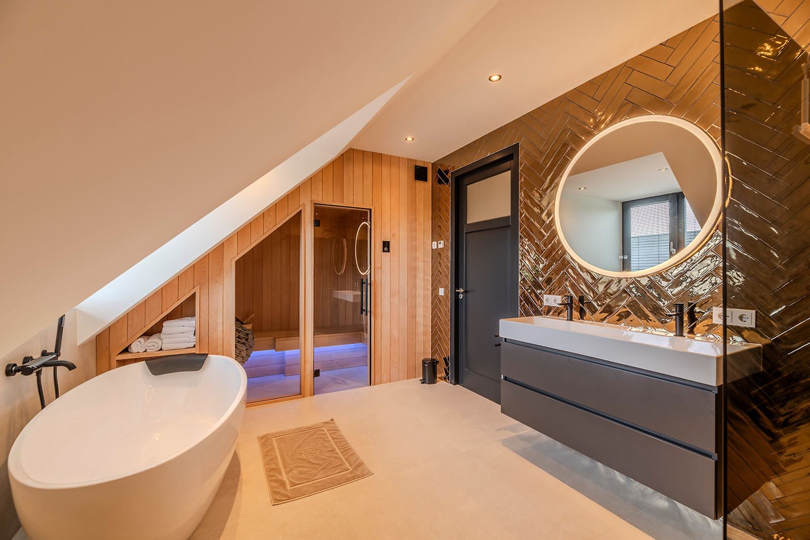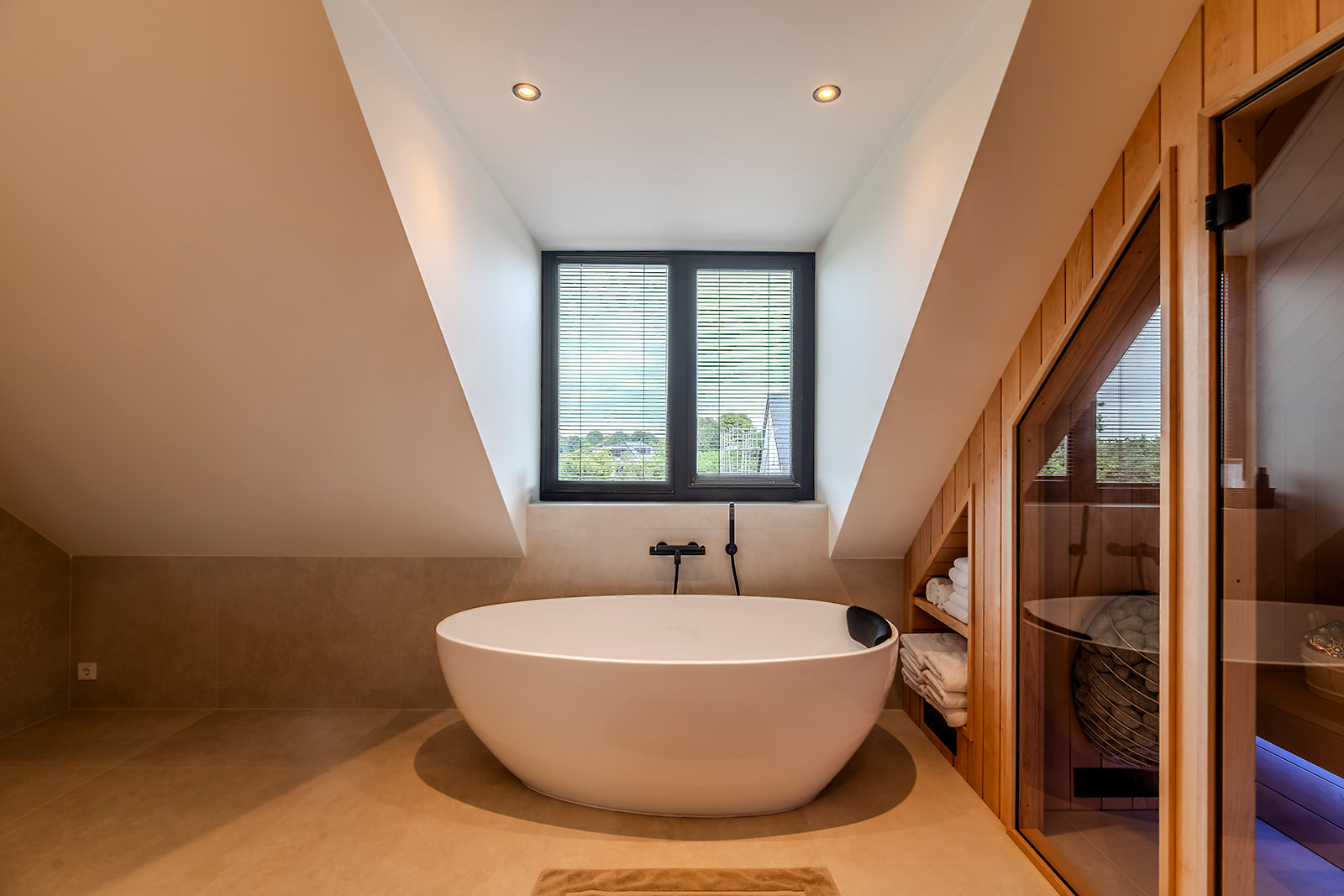De woning is levensloopbestendig ontworpen, met een slaapkamer en badkamer op de begane grond. Vanuit de royale hal is er toegang tot een inloopkast, die direct doorloopt naar de slaapkamer. Op de verdieping bevinden zich twee ruime slaapkamers, een badkamer met ligbad, en zelfs een sauna voor extra ontspanning.